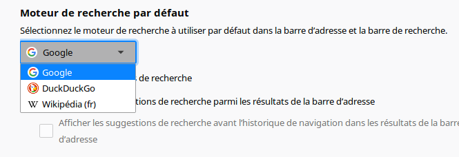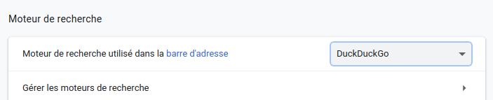 DuckDuckGo. Vous pouvez aussi ajouter d’autre moteur de recherche.