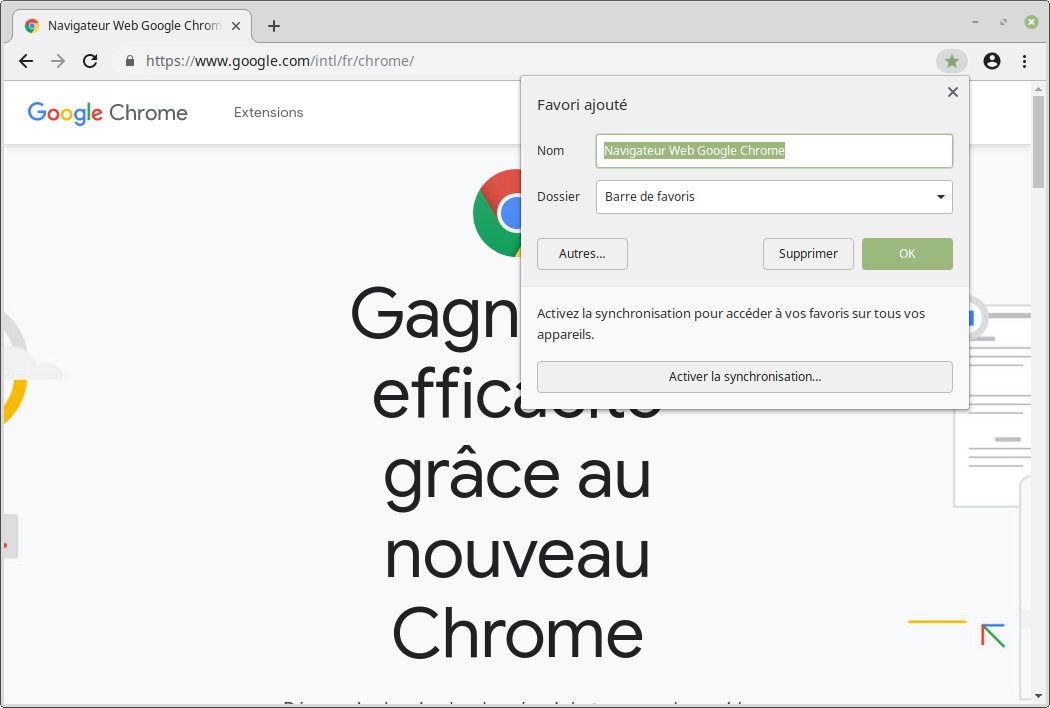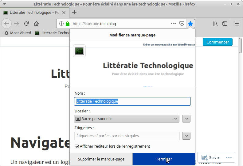 Créer un marque-pageLui donner un nom et déterminer le dossier où le créer