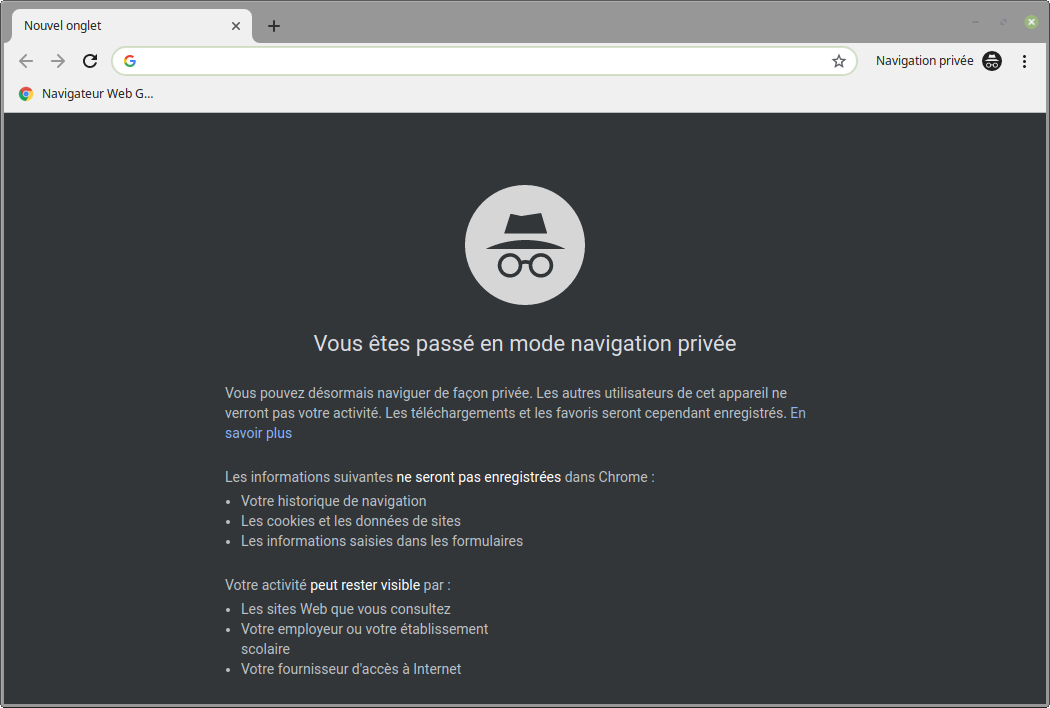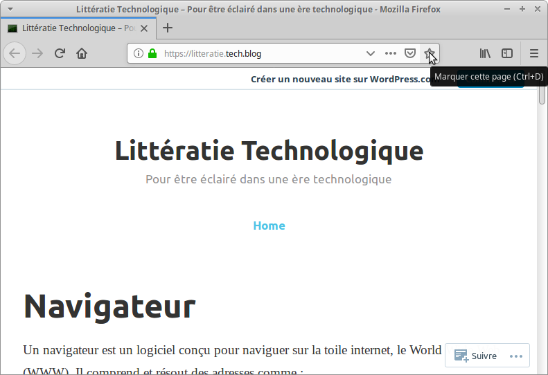 Afin de retrouver des sites web appréciés, nous créons un marque-pages. Cela se fait aisément en cliquant sur l’étoile à la droite de l’adresse du site. Un répertoire des marque-pages se trouve dans la bibliothèque. Le panneau des marque-pages permet de les renommer, les effacer et les organiser.