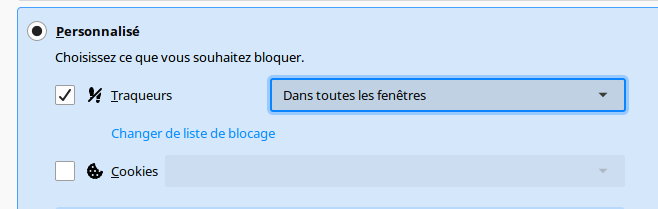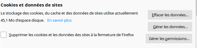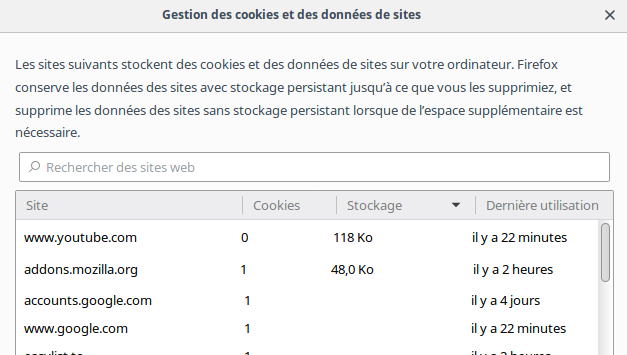 Vous serez peut-être surpris de constater que des sites que vous n’avez pas consulté ont créé des cookies. Il se passe bien des choses à votre insu dans votre navigateur. Certains sites communiquent avec d’autres sites. C’est ainsi que vous obtenez des publicités ciblées selon ce que vous avez consulté au préalable par exemple. Il existe des outils pour bloquer cela. Je vais en parler davantage dans un autre texte. Dans les préférences, vous pouvez bloquer les traqueurs et empêcher ainsi ce comportement.