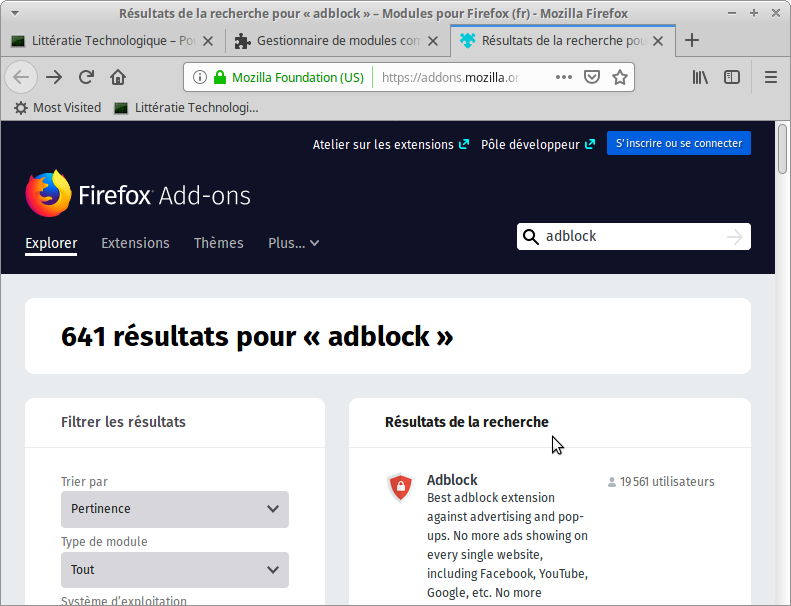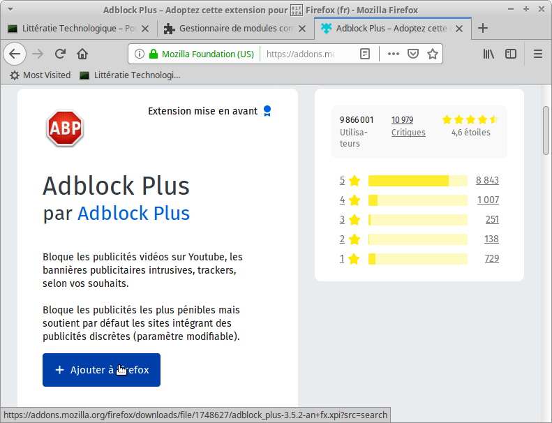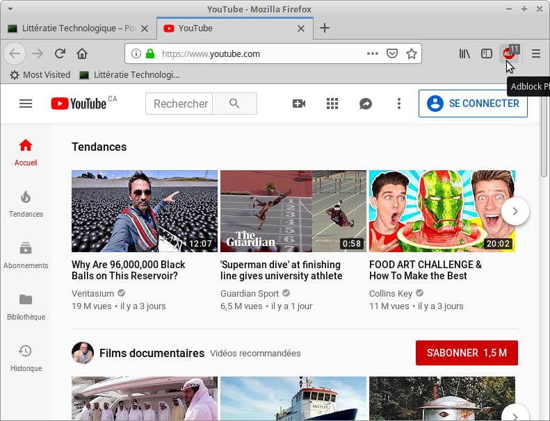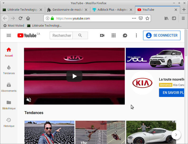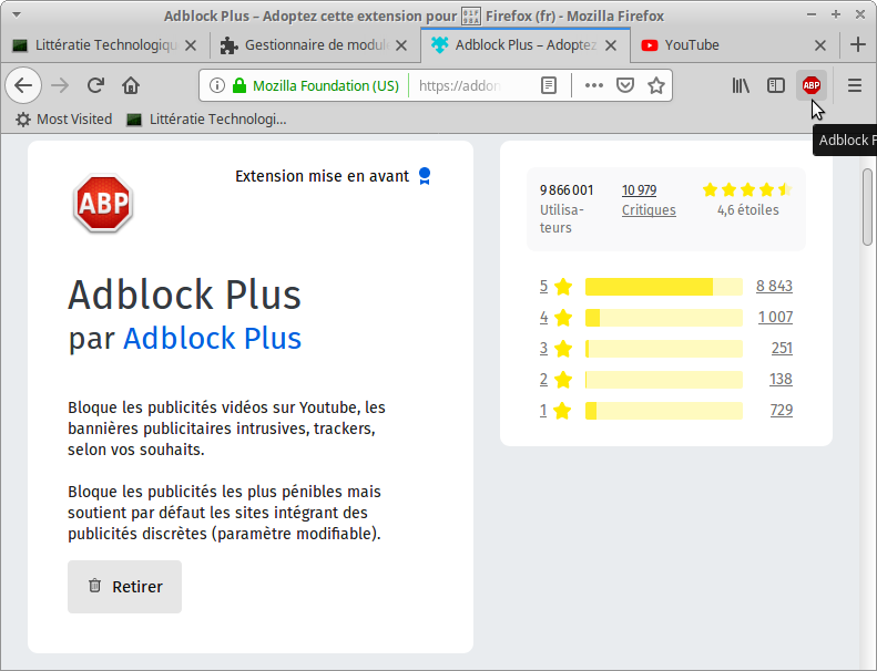 Modules complémentairesÉcran de gestion des modulesRecherche d’un module pour bloquer les publicitésModule Adblock PlusYoutTube avant l’installation du moduleInstallation du moduleYouTube après l’installation du module. 11 publicités bloquées.