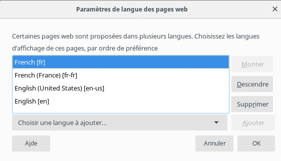 cette section, vous pouvez choisir la langue d’affichage des pages